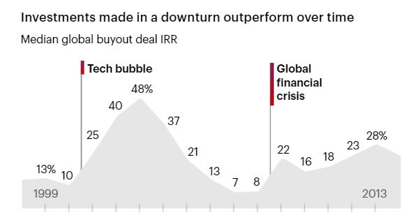 - Deals done through a downturn generate superior returns over time. (see image below)