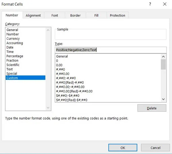 Step 2: Hit CTRL + 1 to open the Format Cells Dialogue Box and navigate to the Custom Number Type box (see above)