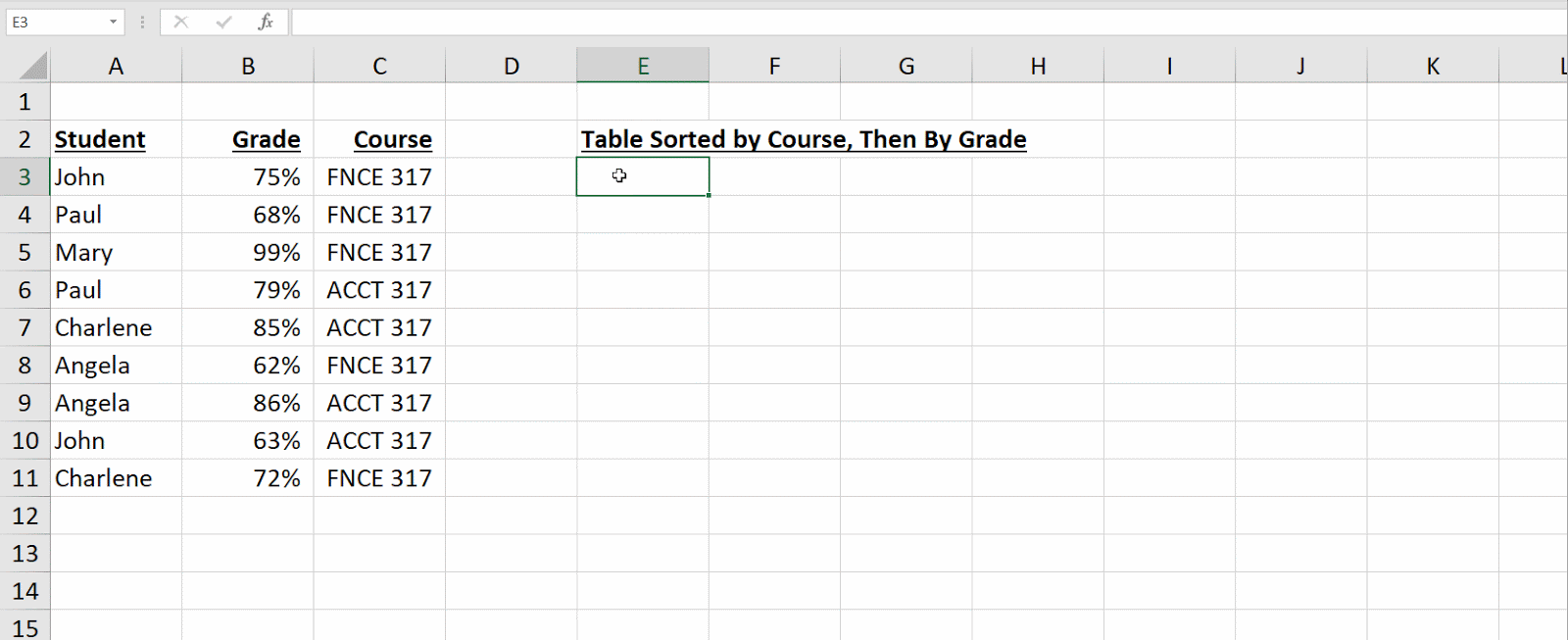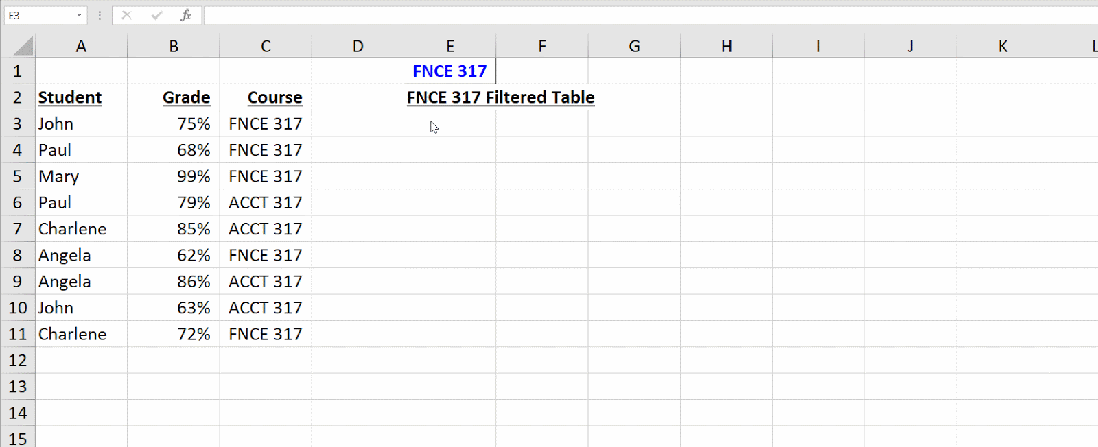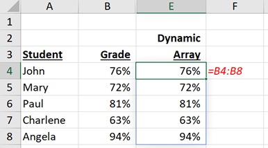 Key to understanding this new feature is to realize that you are only entering the formula in one cell (in the example above, in cell E4). The results of the formula “spill” out of the cell to create the Dynamic Array. The cells below E4 (for example, cell E5), contain information, but do not have an actual formula. If you select the cell, you will see greyed out text in the formula bar showing that the cell contains results “spilled” from a formula in a different location.