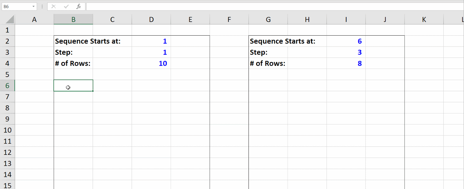 - SEQUENCE: Create a Dynamic Array with a sequential list of numbers with the ability to set starting value and the “step” for each sequence.