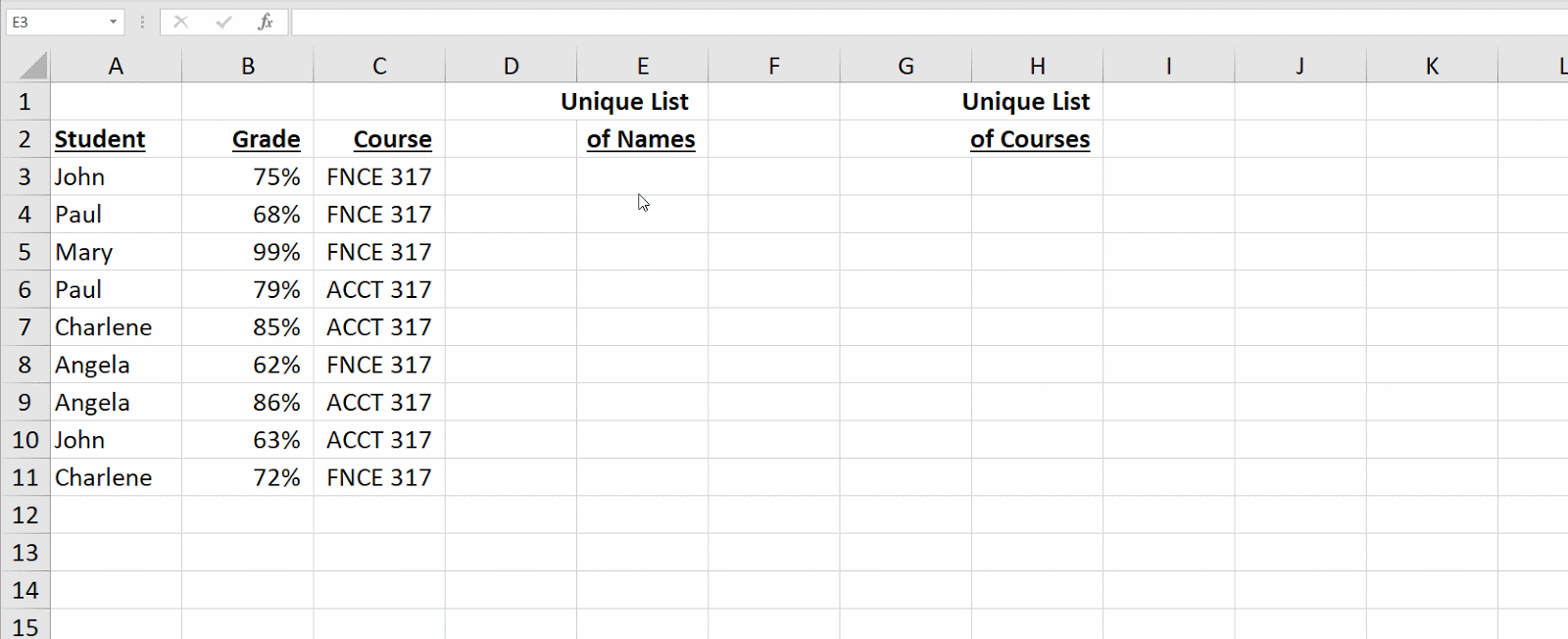 In the past, you would enter a single formula into a cell and it would return a single result. If you wanted additional results, you would need to copy the formula down. For example: